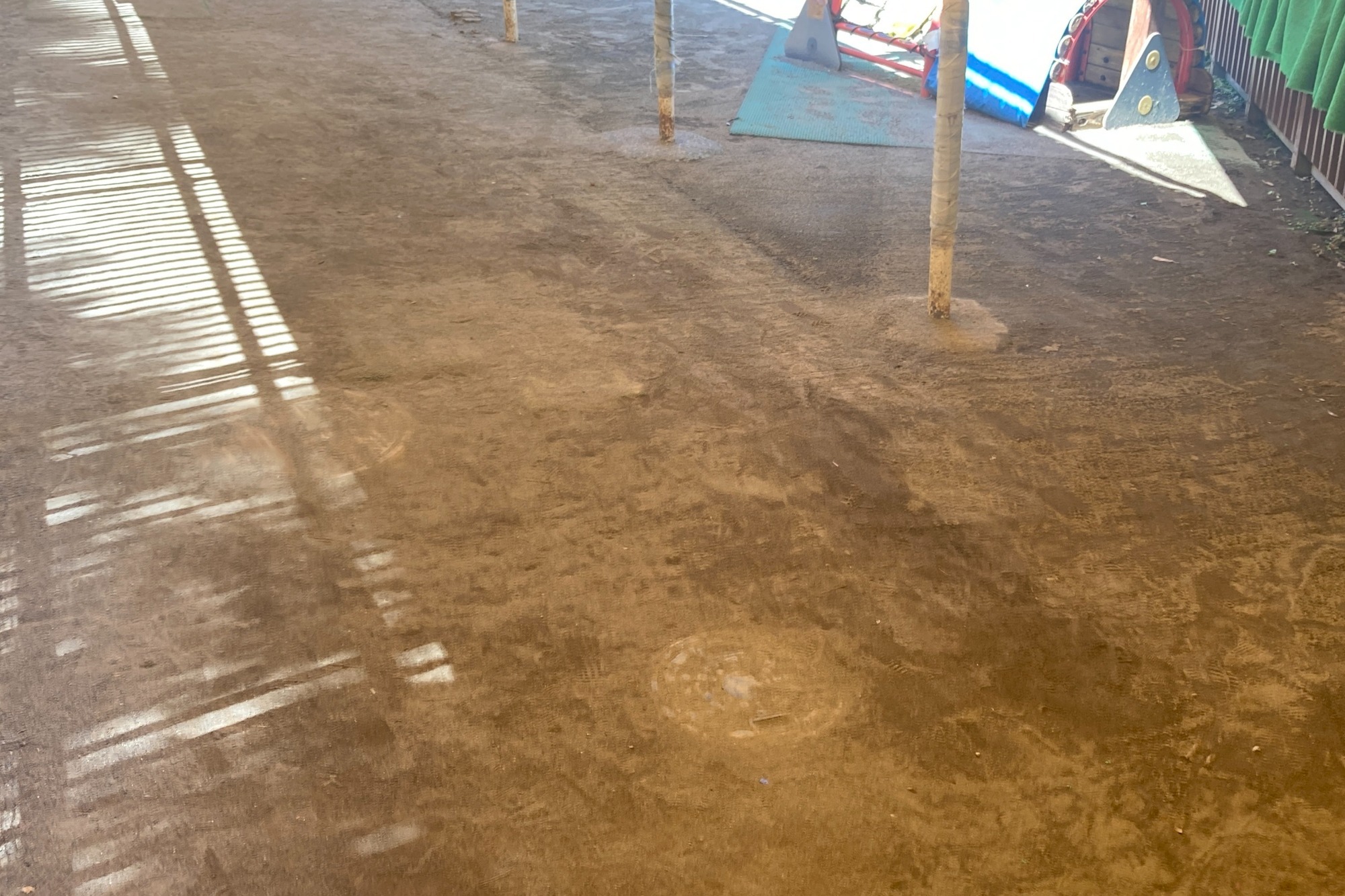 水たまりができて子どもたちが遊べるようになるために時間がかかります。